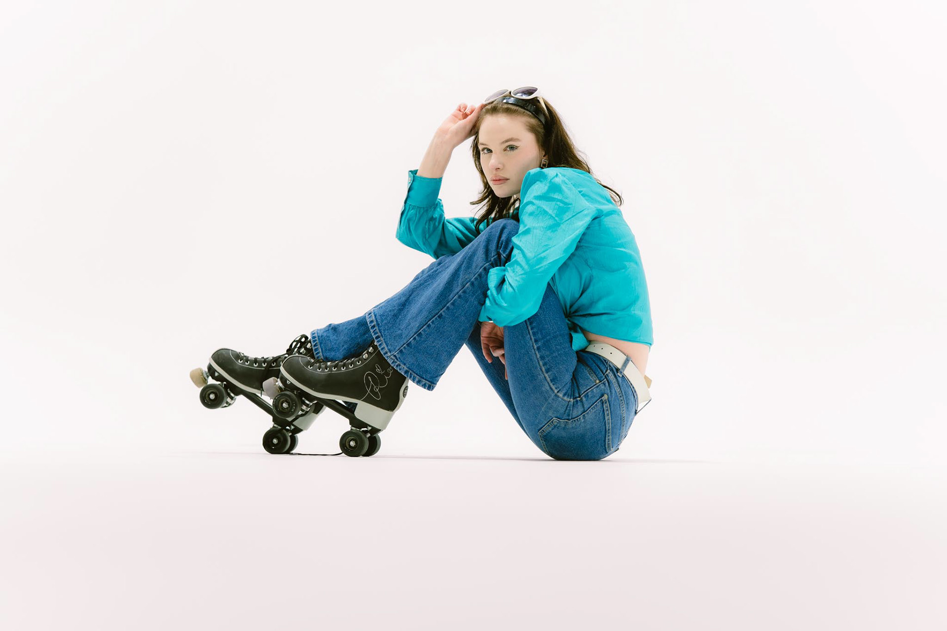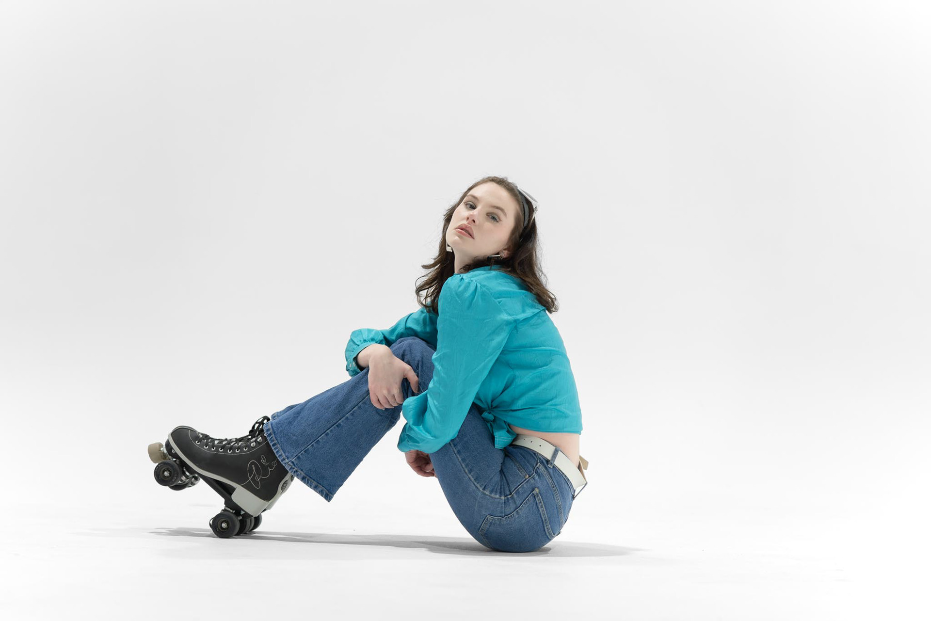 “Studio Skater” is a playful blend of fashion and movement, capturing a retro roller-disco vibe within a clean, minimalist studio setting