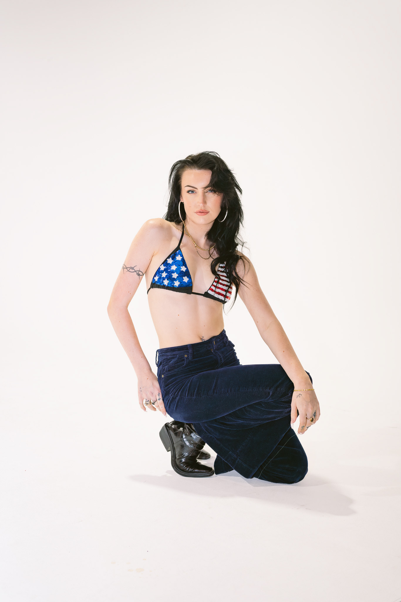 A daring twist on nostalgia—velvet, attitude, and Americana energy collide for a look that’s rebellious, radiant, and unmistakably modern.